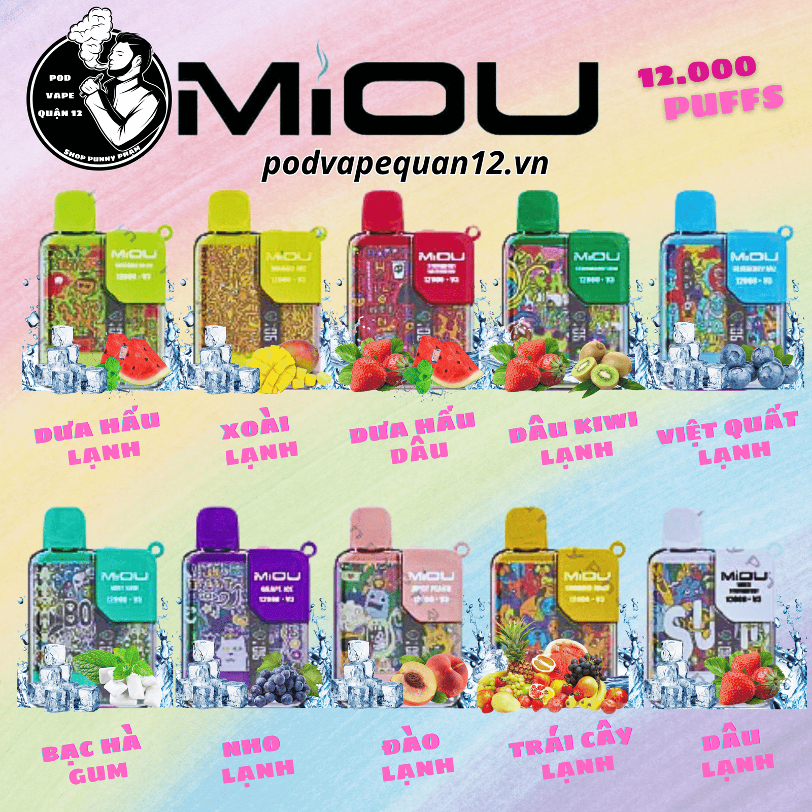 | Vị | Xoài Lạnh / Mango Ice, Nho Lạnh / Grape Ice, Dưa Hấu / Watermelon Ice, Dâu Lạnh / Strawberry Ice, Nước Ép Đào / Juice Peach, Việt Quất / Blueberry Ice, Dâu Dưa Hấu / Strawberry Watermelon, Trái cây / Summer Juice, Dâu Kiwi / Strawberry Kiwi, Việt Quất Dưa Hấu / Blueberry Watermelon |